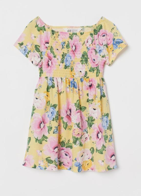 Платье с короткими рукавами из мягкого хлопкового трикотажа с рисунком, квадратным вырезом горловины, сборкой сверху и расклешенной юбкой. Состав: Хлопок 100% Возраст 4-6лет ПОГ - 26,5см ПОТ - 26см ПОБ - 38,5см Длинна - 57см