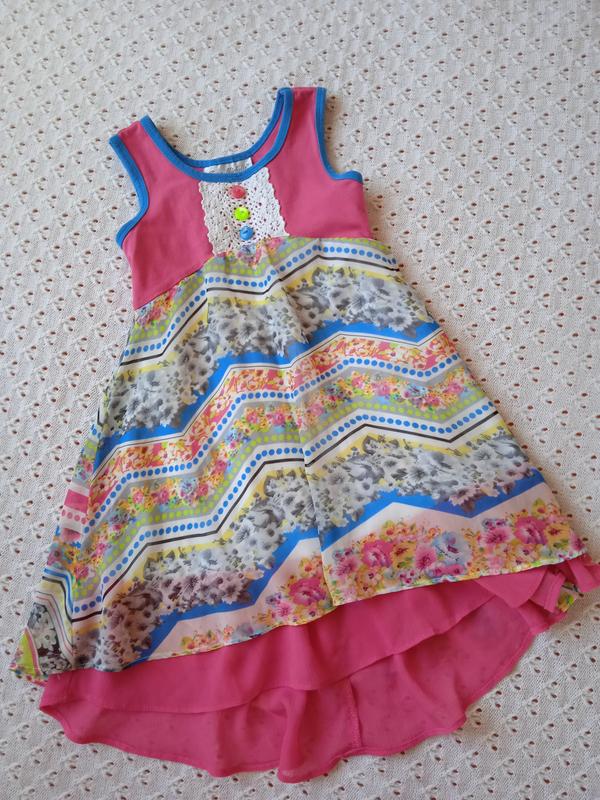 Дуже красива літня сукеночка бренду Jona Michelle в ідеальному стані. Розмір вказаний 3 роки. Верхня частина - трикотаж, прикрашена різнокольоровими гудзиками. Нижня - м'яка підкладка і шифон. Кольори яскраві, насичені. Позаду подовжена. Виглядає дуже ніжно і стильно! Якість тканини і пошиття дуже хороша. Довжина спереду 52, ззаду подовжена 57, ширина під рукавами 25 см. Дивіться також інші мої оголошення.