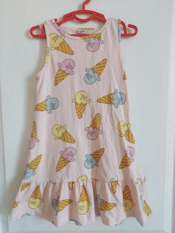 Платье без рукавов из хлопкового трикотажа с принтом мороженое. Возраст 5-6 лет, рост 110-116см ПОГ - 30см ПОТ - 32см ПОБ - 34,5см Плечи - 21,5см Длинна - 58см