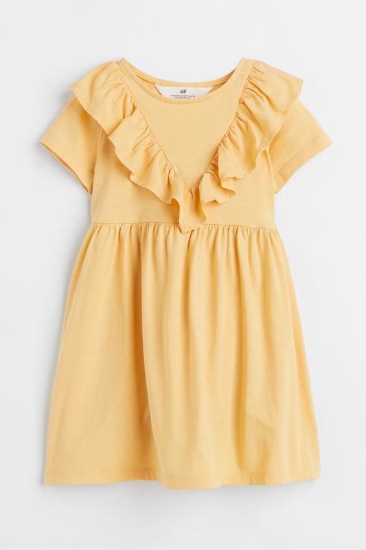 Сукня з бавовняного трикотажу з коротким рукавом. V-подібний виріз, оброблений воланом, який тягнеться від плечей до спини. Плісований шов на талії і злегка розширена спідниця. Без підкладки.