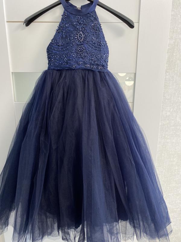 Темно синя сукня. Ззаді на потаємному замочку та ґудзиках.