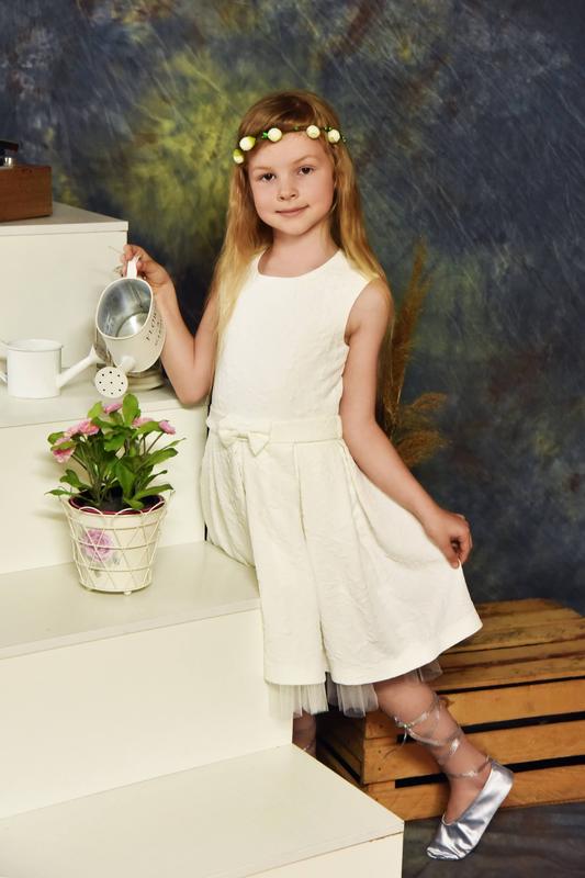 Сукня "Жаклін" Ціна - 850 грн Плаття для дівчинки 7-8 років. Обхват грудей 64-66 см. Довжина від плеча до талії - 32 см. Довжина спіднички - 40 см. Тканина - жаккард. Підкладка - атлас. Колір - молочний.