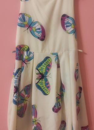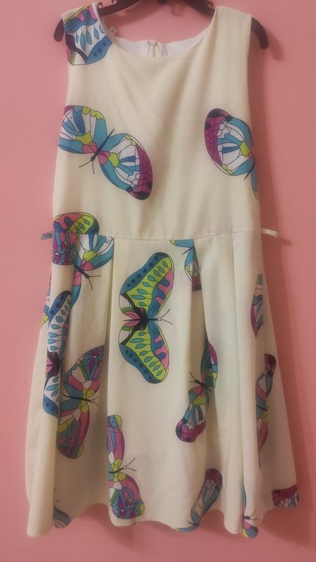 Сукня, шовк Армані, принт в метеликах Є петельки для пояса. На блискавці Облягає і трохи тягнеться З білим подьюпником Вся Довжина 77 см Довжина до талії 31 см ПОГ 36 см ПОТ 33 см
