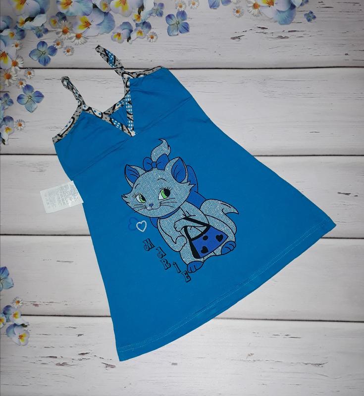 Літній сарафанчик з котиком, для дівчинки. Розмір 98-104 Стан новий, з бірочкою Тканина 100% бавовна Колір бірюза Довжина 51 см Відправка новою або укрпоштою.