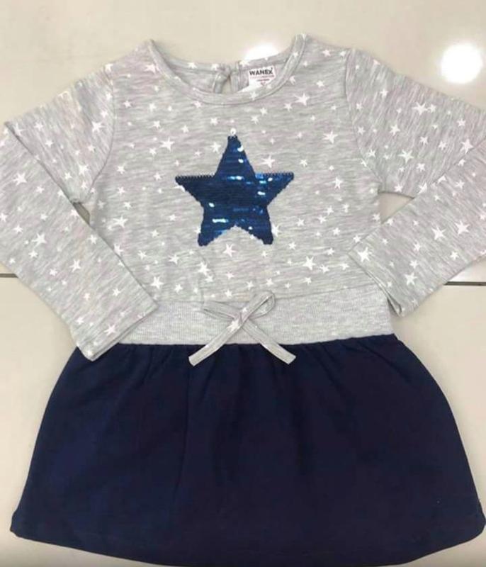 Классна стильна сукня на дівчат в поєднанні синього та сірого кольорів в принт зірочок та посередині прикрашено зірочкою з паєток. Сукня дуже зручна та приємна до тіла. Матеріал бавовна. Виробник Туреччина фірма Wanex