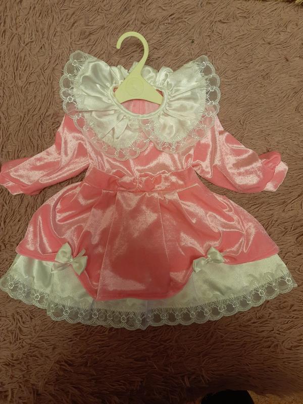 Платтячко рожевого кольору, довгий рукав, на вік 6-8 місяців, тканина-велюр з білим під'юпником, мереживний комір. В бокові шви вшиті поясочки для зав'язування ззаду. Блискавка на спині. Чудове вбрання для свята та фотосесії. Довжина-40см, ширина в талії-24см, рукав-25см.
