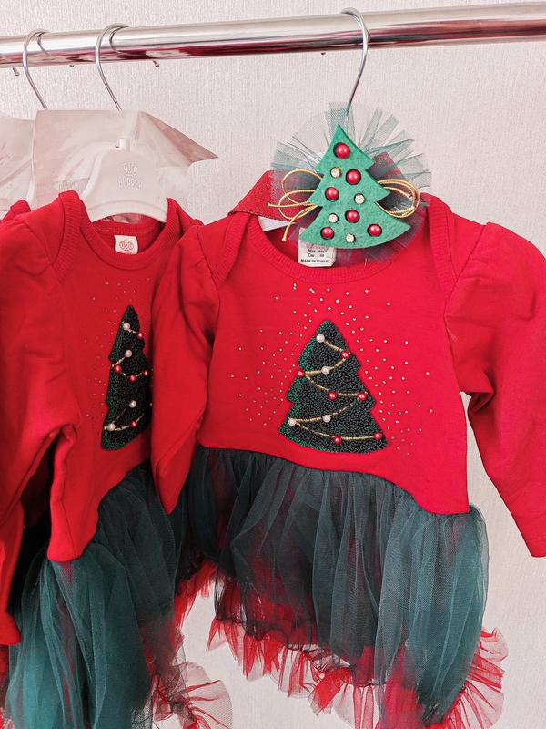 Новорічне боді-плаття з пов’язкою. Боді на флісі з фатіновою спідничкою і пов‘язка з ялиночкою. Пошиті з бавовни. Розміри: червоне 6м(68см) 18м(86см) зелене 6м(68см) 12м(80см) 18м(86см)