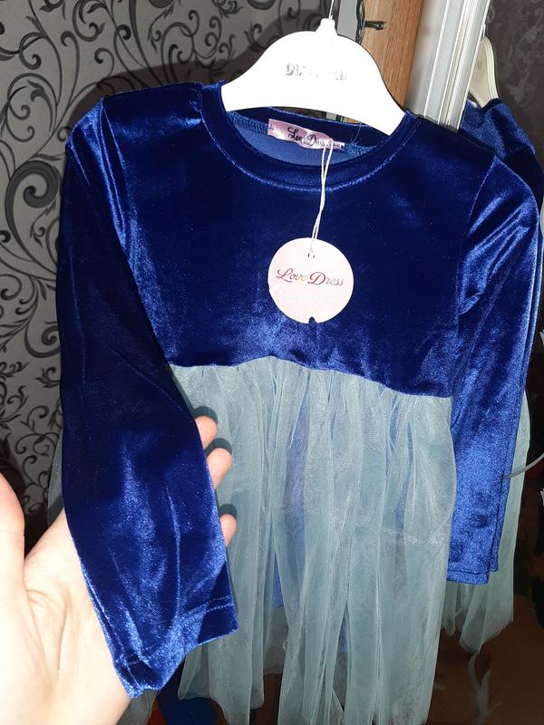 Продам нарядне нове платячко, купили і ні разу не одягнули( тепер маленьке) на 2-3рочки, тканина верх дорогий бархат+низ євросітка, заді на спинці гарний бант, з євросітки, колір такий як на фото синій+березовий) Довжина плаття 54см