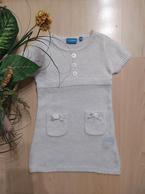 Продам вязаное платье для девочки, б/у, состояние нового, было одето два раза, идёт под гольф. По всей пряже проходит люрексовая нить серебристого цвета.Длина по спинке 55 см.ПОГ 31 см.
