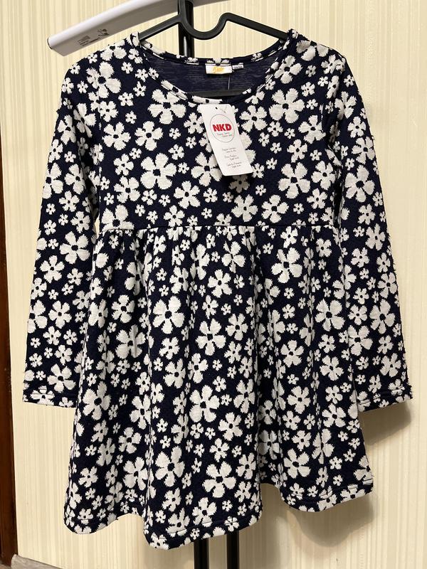 Гарна дитяча сукня з довгим рукавом в білий квітковий принт темно-синього кольору. Нова з біркою NKD. Розмір - 134/140
