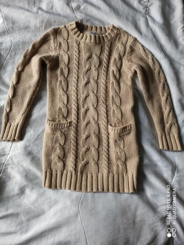 Теплое шерстяное платье с длинным рукавом крупной вязки. Есть два кармана.