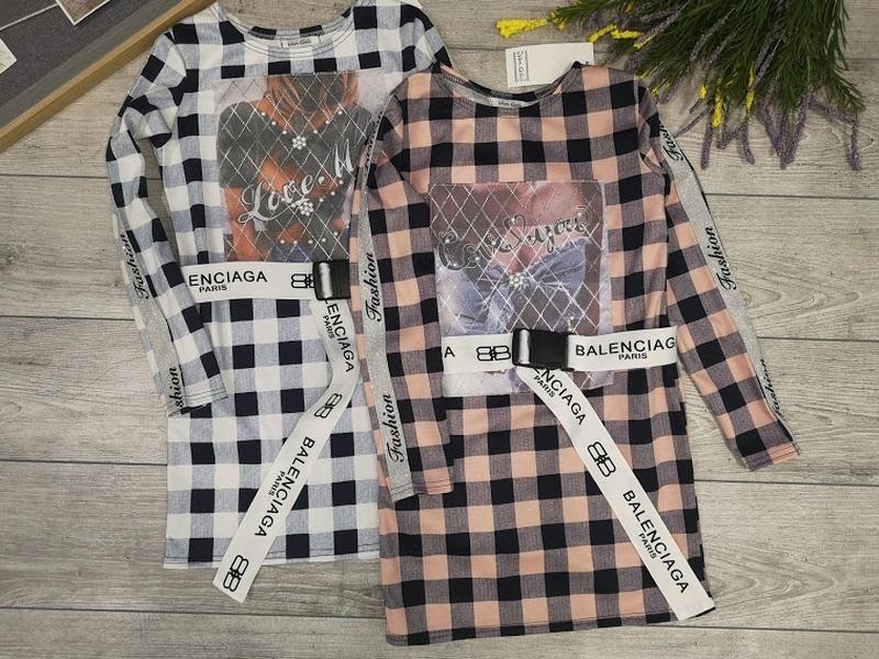 Модное платье для девочек в клетку. Ткань французкий трикотаж.Супер качество. На рукавах серебристые лампасы. Пояс в комплекте. Замеры: Длина/ ширина/ рукав от плеча 128р-62/35/44 134р-66/36/45 140р-68/38/47 Цена 420 Розовое : 128-1шт 134-1шт 140р-1шт Белое: 134-1шт 140р-1шт