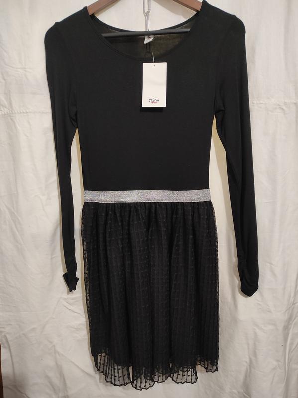 Трикотажное платье для девочки рост 146/152 верх и рукава трикотаж,низ сетка плиссированная,пояс резинка серебристая ПОГ 37 см ,тянется ПОТ 32 см , тянется длина рукава от плеча 62 см длина 85 см