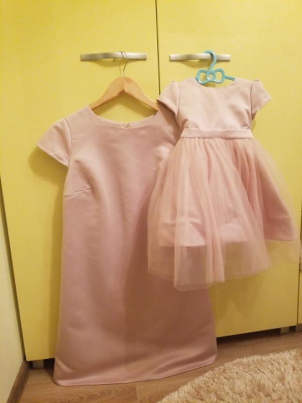 Плаття Фемелі лук. Дорослий м. Дитяче на 1 рік ( Можна і довше ) . Довжина 89 см. Груди 46 см. До низу вільно. Дитяче довжина 54. Ширина 29. Звужуються бантом.
