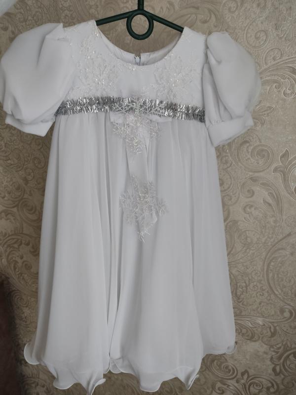 Білосніжна пишна сукня, якість на вищому рівні. Одягнуто було один раз на свято Дождік і сніжинки можна відпороти. Підійде на дівчинку 4-6 р. но можливо і довше, дивіться заміри Довжина 65 см. ПОГ 29 см. Ширина плеч 24 см Стан нового. Без торгу.