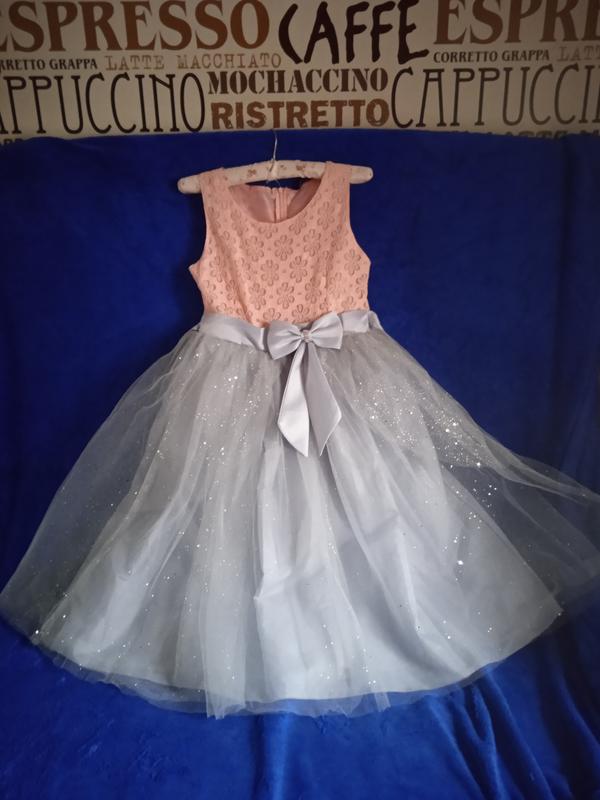Невероятно красивое платье верх из кружева лососевого цвета юбка сестельного цвета в блестящих зрачках юбка в пять слоевой.позада потайная молния и поясок. Длина 98 НОГ 42 НОТ 38 регулируется поясом