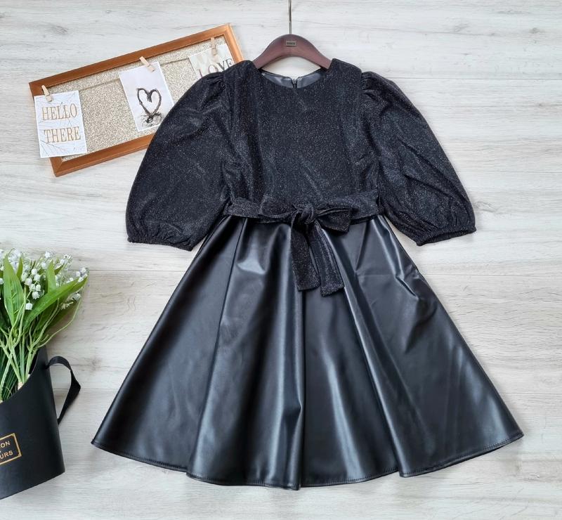 Стильное и эффектное платье Ткань люрекс+эко-кожа, поясок в комплекті рукавчик 3/4 качество люкс РЕКОМЕНДУЮ!! 140(1 шт)-длина 74,рукав 37, пог 38 146(2 шт)-длина 77,рукав 39, пог 40 152(2 шт)-длина 79,рукав 40, пог 41 158(1 шт)-длина 83,рукав 42, пог 42 164(1шт)-длина 85,рукав 43, пог 43 +-2 см