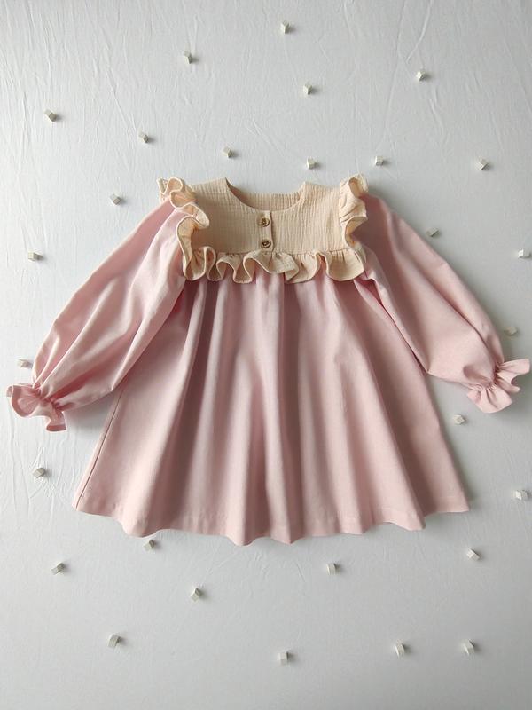 Дитяча сукня з пом'якшеного льону та мусліну. Довжина по спинці 56см, довжина рукавчика 43 см, там резиночка, тому можна робити більш об'ємним та коротшим за потреби. Кокосові гудзики.