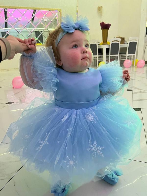 Сукня сніжинка на 1-1.5 ,орієнтуватись на заміри,так як шили під замовлення.Одягалась 1 раз,в ідеальному стані Рост 77 Плече коліно-45 Талія 58 Пінетки і пов’язка в подарунок , купували значно дороще