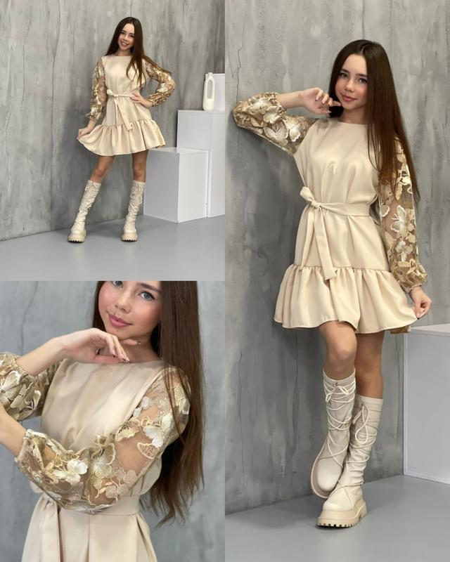 праздничное платье с изысканным гипюром на рукавах тканина= костюмний креп пояс у комплекті рекомендую!!!! цена 790 грн размер 128 140 152 164-темного цвета нет арт77