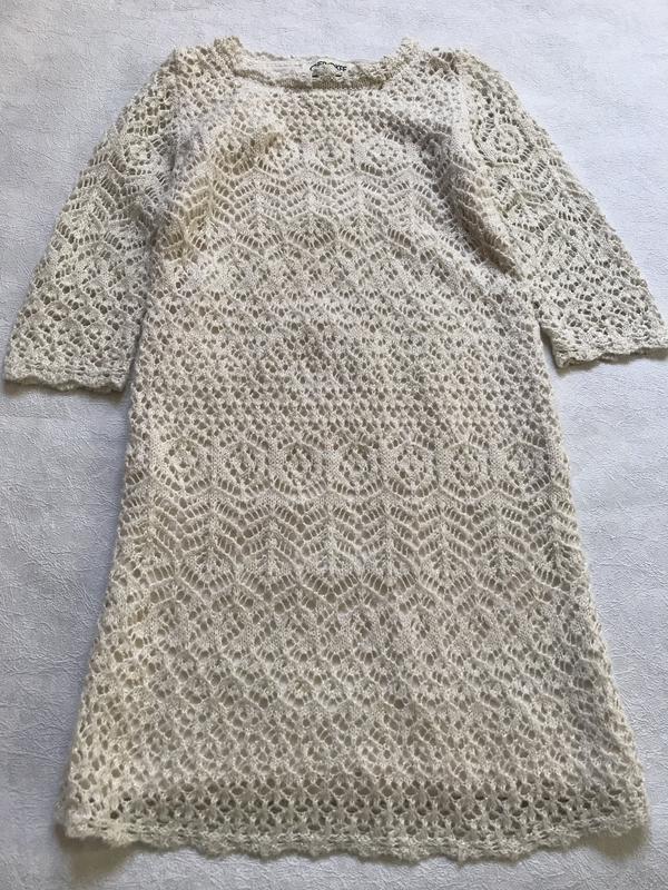 Оригінальне вязане платтячко на 6 рочків . Нитка з золотим люрексом . Ажурна вязка . Має тепленьку підкладку по тілу. Розмір 6. Довжина по спині 63 см. Рукав 32 см. Плечі 25 см. ПОГ 32 см. Стан дуже добрий практично ідеальний . В двох місцях витягнута ниточка , не помітно