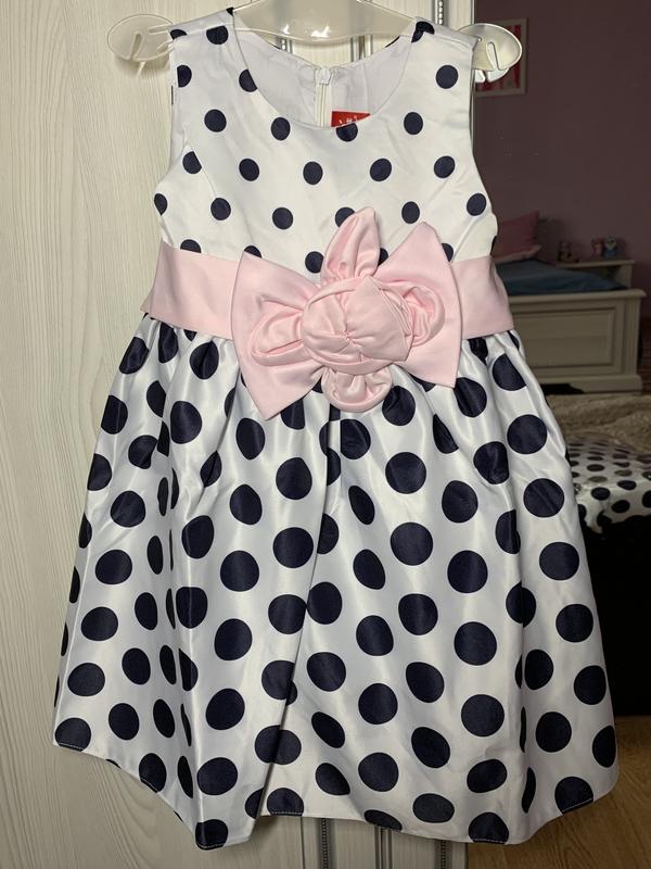 Белое платье в черный горошек с розовым бантиком Ткань - плотный атлас Подкладка коттон + фатин В наличии два размера: 1. Подойдет на 4 года, длина - 57см 2. Подойдет на 8-9 лет, длина - 80см
