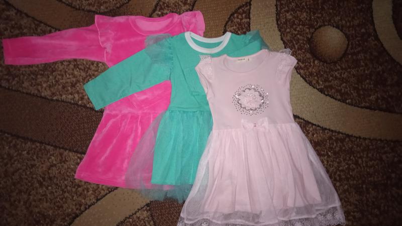 Продам комплект суконь для дівчинки:рожева тепленька з довгим рукавом, бірюзове з фатином на спідничці і рукавах,літнє світло рожеве з фатином на спідничці,червоний вельветовий сарафанчик,тепле червоне(короткий рукав) з білим болєро ,пишненька спідничка,сіра кофтинка і еспадрильї (розмір 25) в подарунок.На вік приблизно від 1.5 р.до 2.5 р.Ціна за все 400 грн.Є відео огляд.