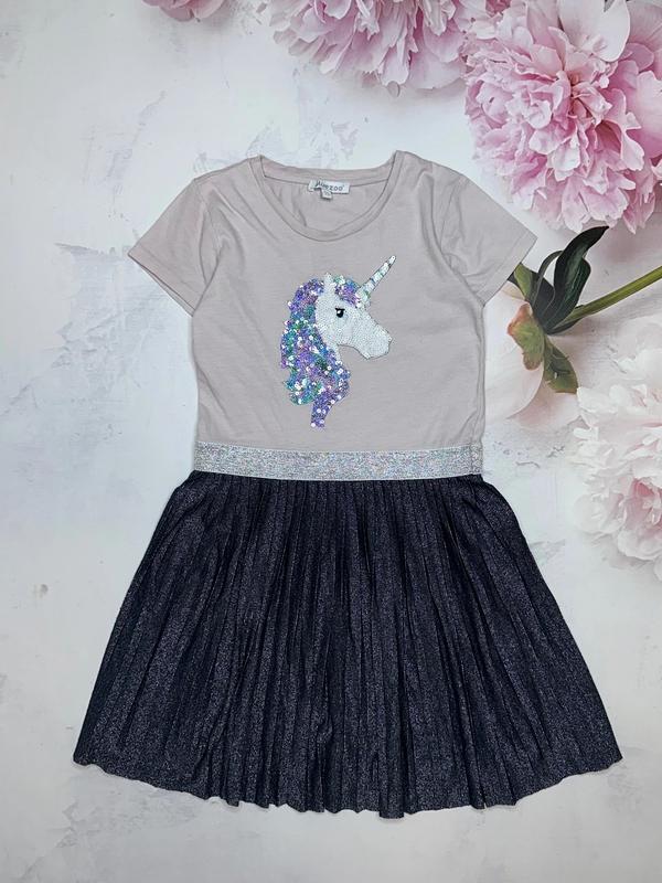 Платье с единорогом. Верх коттон, юбка блестящая с подкладкой, единорог из пайеток. 7-8 лет bluezoo Длина 65(29). ПОГ 31
