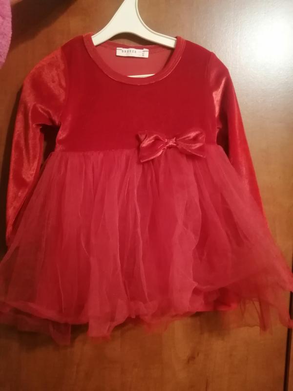 Плаття для дівчинки, святкове вільветове,красивого червоного кольору, фото не передає цього. Є невеличка дірочка видно на останньому фото, але її не видно при носінні. Заміри рукав від плеча 31см,плечі 23см,довжина плаття 43см,довжина юпки 24см