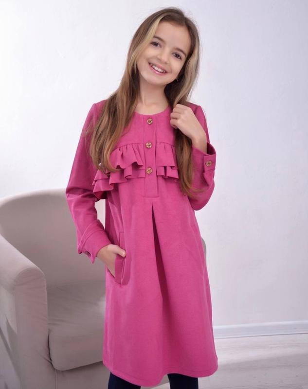 НОВИНКА! 🍰Красивое платье свободного кроя ткань замш диагональ(очень приятная на ощупь) манжеты и планка на пуговицах 🍰прикрашена пишними воланами РЕКОМЕНДУЮ! размер/🍰длина/пог/рукав от плеча 134/🍰73/38/49- 140/🍰78/40/53- 146/🍰79/41/56- 152/🍰8**********/43/60- +-2см