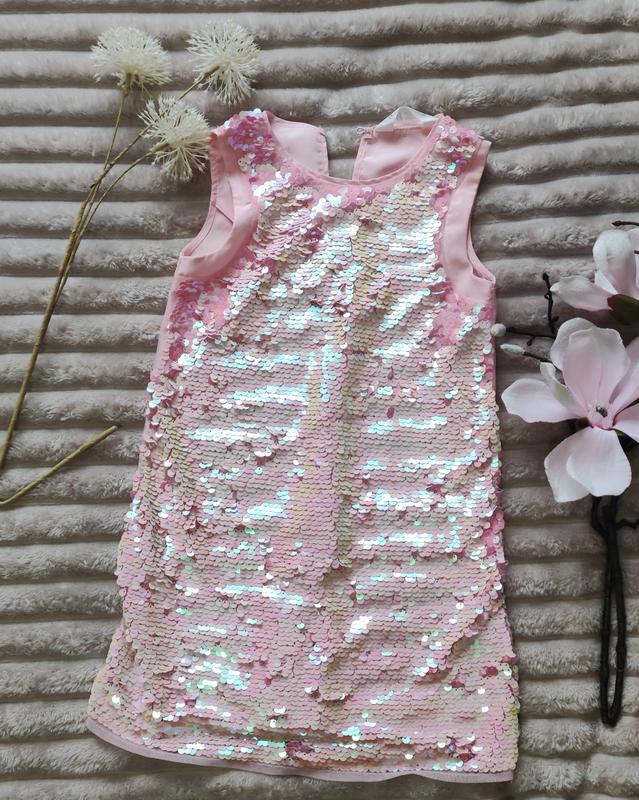 Літнє легеньке плаття з паєтками в ідеальному стані, без плям та потертостей. Для дівчинки 5-6 років. Фото погано передає блиск паєток, але в реальності все виглядає гарно. Заміри: Від плеча до паху 15 см. Обхват грудей 31 см. Довжина виробу 59 см.