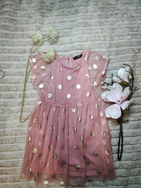 Легкое розовое платье с золотыми горошками. Верх фатин, под ним подкладка приятная к телу. Замеры: От плеча до паха 14 см. Обхват грудей 34см. Длина изделия 60 см.