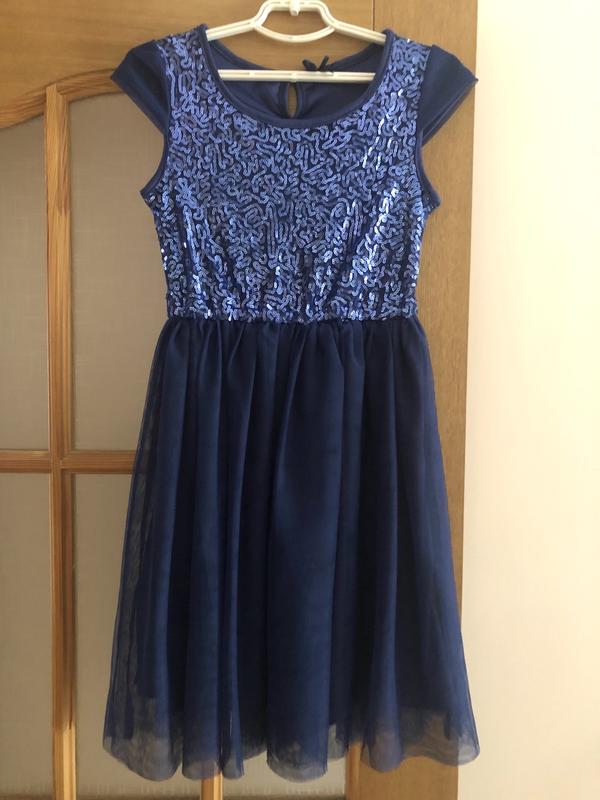 Красивое нарядное платье на девочку 7-8 лет, 128 размер, указано на бирке. Ориентируйтесь по замерам. Верх пайетка, низ и рукавчик фатин. Красивого насыщенного темного синего цвета. Длина по спинке 74 см. В поясе (на резинке) поб. 27 см., тягнеться до 35 см. В плечах 28 см. Под пашками поб. 34 см. Стан идеален, есть две затяжки на фатине, но не заметно, разве осмотреться и искать.