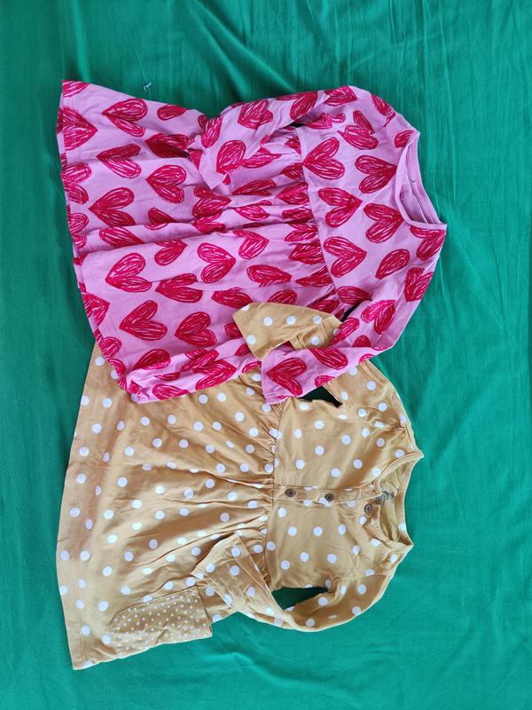 Набор ярких коттоновых суконочек на девочку. Желтая Carters по бирочке 24 мес, розовая f&f по бирочке 2-3 года, но по факту две одинаковые (фото 3) на рост где-то до 92- 94 см. На рост Стан очень хорош, носили мало быстро выросли. Цена за 2 шт.