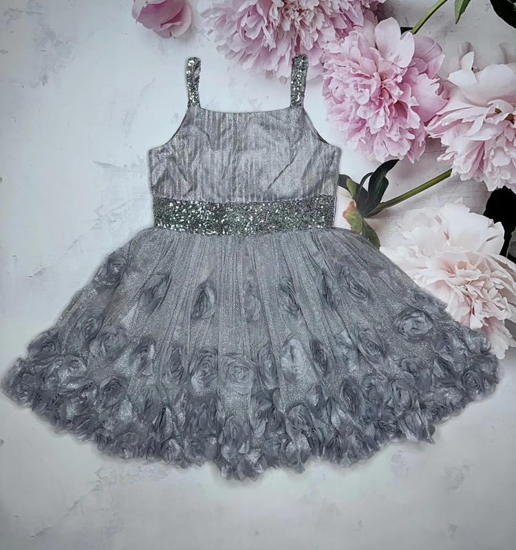 шикарное платье известного бренда Monsoon Объемные розы Полностью блестящее Пояс и брительки украшены пайетками. Юбка из 3-х слоев. Застёгивается сзади на змейку На талии завязывается бант. Состояние платья КАК НОВОГО, не хватает только бирки😉 🏷MONSOON 🔹10лет Длина 73(26). ПОГ 36
