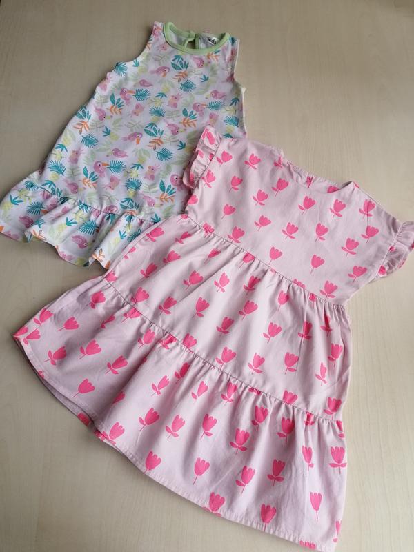 Одним лотом красивые фирменные платья на девочку 1,5-2 года. Трикотажное с попугаями M&Co. Хорошее состояние. Длина 47-48, под руками 25,5, внизу 37 (как трапеция). Розовое с цветами M&S. Коттон 100%.Очень хорошее состояние, с нюансов спереди есть пару точек незначительных (крайний фото).Длина 48-49, под руками 29,в талии 26. Цена за два 150грн.
