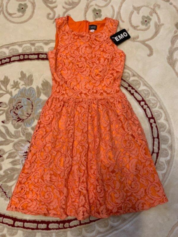 Великолепное кружевное платье ярко- оранжевого цвета, размер 34 указан. Длина- 84см, пог-38см, пот-32см, бедра произвольные. Ткань верзня пружинит, тянется, а атласная подкладка нет, сзади замочек потайной.