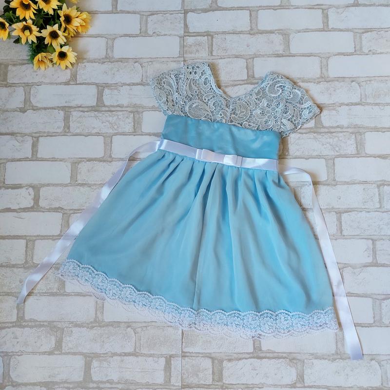 Нарядное голубое платье на девочку с кружевом новое Размер 3-4 года, на рост 98-104 см Замеры: длина 64 см рукав 10 см плечи 27 см полуобхват груди 30 см полуобхват талии 30 см цвет голубой состав кружево,шифон,полиэстер сзади на молнии,с поясом