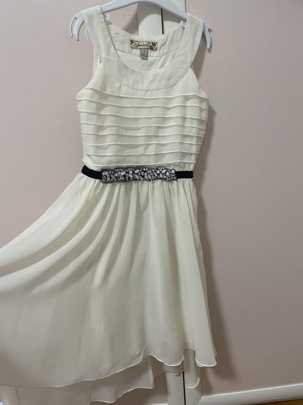 Дуже гарна та вишукана сукня для маленької леді! Сукня молочного кольору з чорним поясом який прикрашений камінням виглядає дуже круто!!