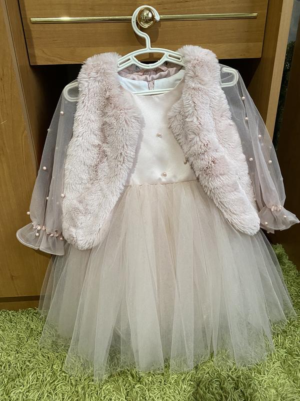 Идеальное состояние, одетая на час для фотографий. Размер платья 90 см.. Под фатином подкладка,цвет пудра. Длина платья -50 см Рукав от шеи -33 см от плеча 30 см Талия -25 см Грудь-23 см