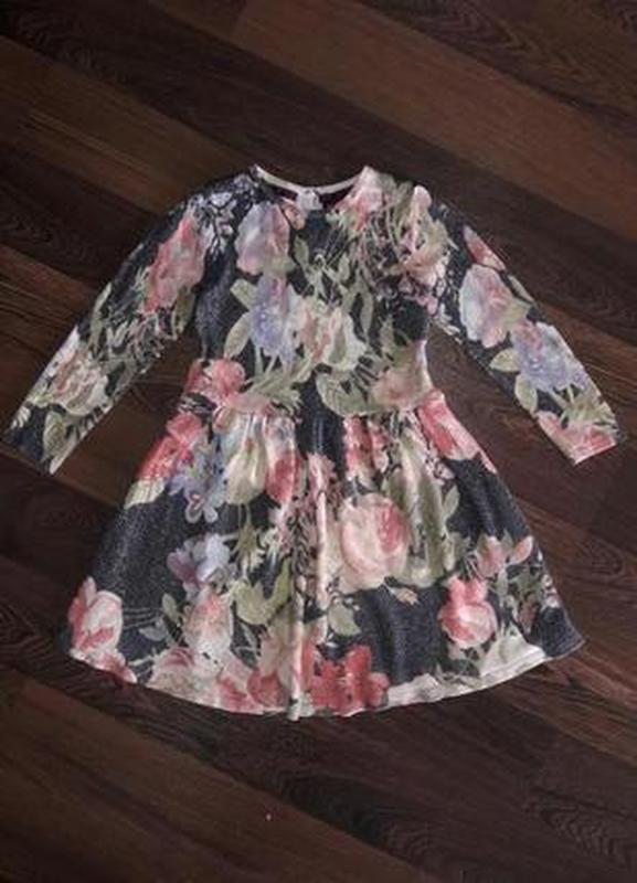 Красивое платье с цветочным принтом на 4 года и нитью люрекс состояние отличное ткань мягкая и плотная дл. 56, шр 27 и очень хорошо тянется рукав от плеча 33,5 + плечевой шов 5,5 от плеча до талии 25,5 Багато речей на цей вік. Є система знижок