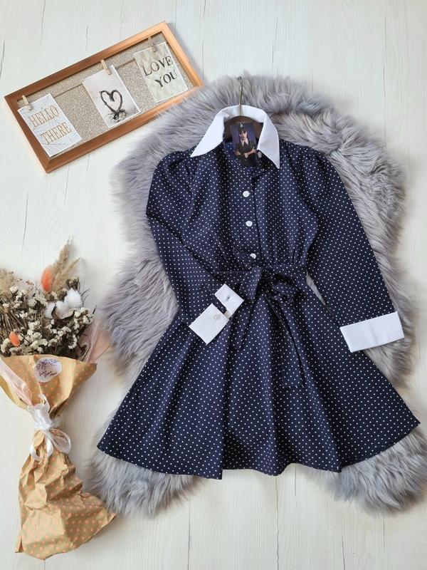 ландыш В НАЯВНОСТІ!!! Платье для девушек, которые в тренде. ткань в мелком горошек, манжеты и воротничок беленьки. Классика во всей красе. Тканина супер-софт Поясок в комплекте цвет темно-синий 128(5 шт)-длина 67,пог 33,рукав от плеча 44 134(4 шт)-длина 71,пог 35,рукав от плеча 46 140(2 шт)-длина 76,пог 37,рукав от плеча 49