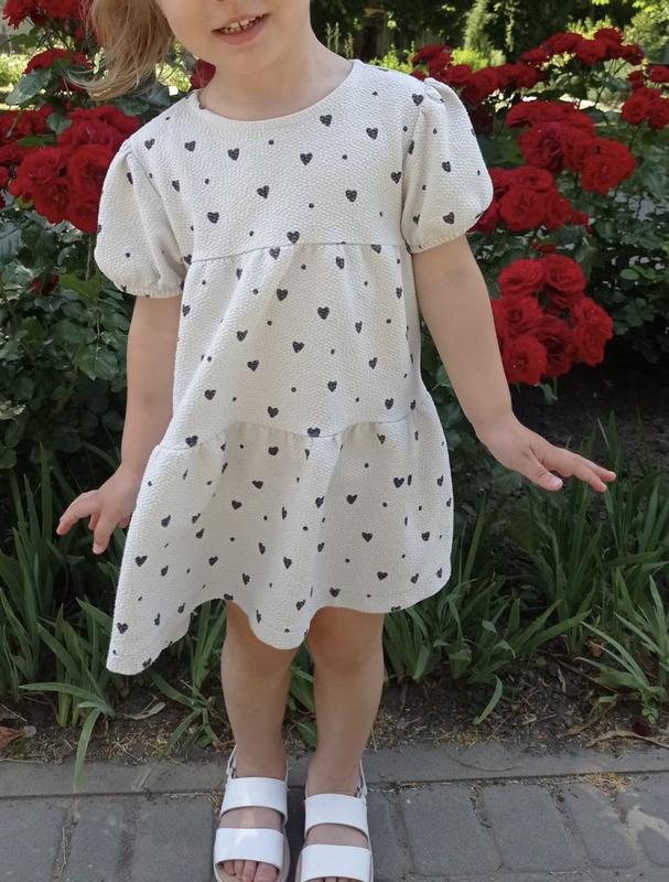 Платье в сердце Zara Размер 2/3 года Состояние отличное, единственный дефект полосочки даже не дефект, а брак На фото ребенку 3 года Замеры Плечи 26 Рукав от горла 17 от плеча 12 от подмышки 5 ширина внизу 60 ПОГ 30 Полностью длинна по спинке 47.5 от плеча вниз 48