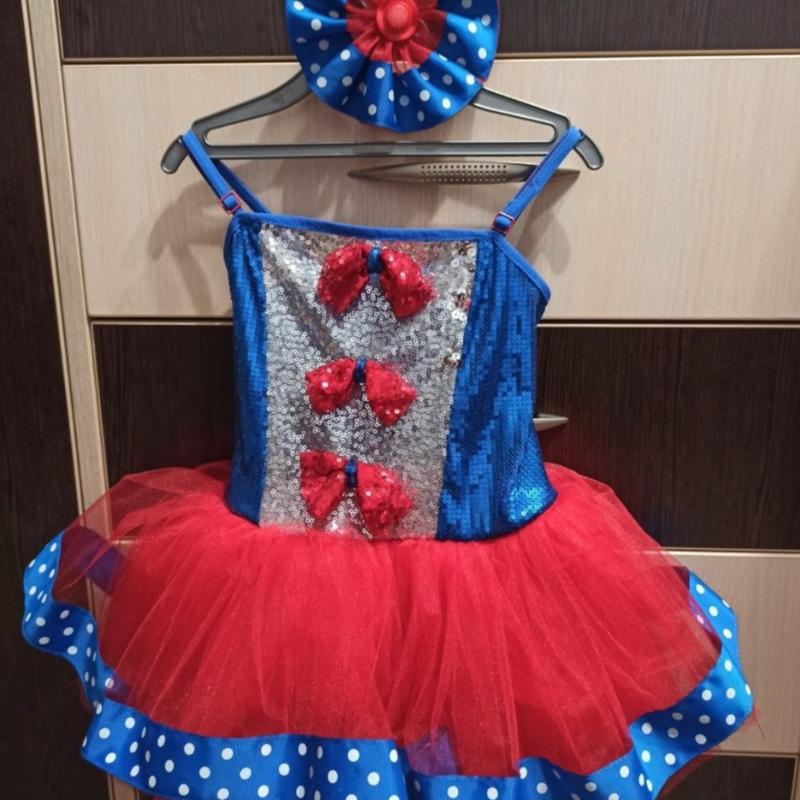 платье подходит для выступлений в детском саду, в студиях танцев. Подойдет на девочку на рост 104-116. На голову бантик.