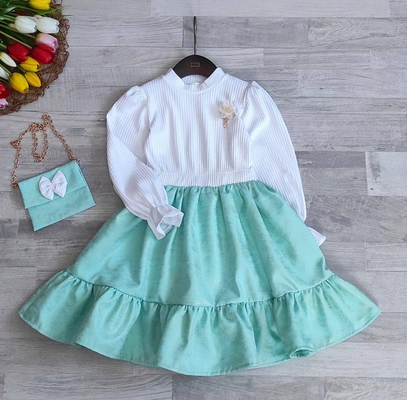 😍😍Чудове,нарядне платтячко з сумочкою тканина верх мустанг в поясі резиночка 💸💸Ціна:550 грн заміри:довжина/рукав від плеча/пог 104-55/38/24 110-60/40/25 116-65/42/26 +-2см 🤍🤍🤍