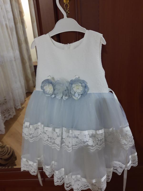 платье для девочки бело-голубое длина 50 см пояс 25 см, с съемной брошью