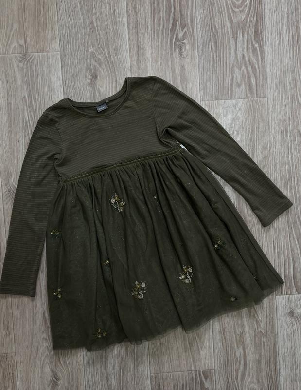 Платье цвета Хаки На юбке вышивка и золотистое напыление Юбка 3-х слойный фатин на подкладке котон Верх по типу лонгслива Состояние отличное 🏷️next 6-7 лет/122 Длина 65(20). ПОГ 31. Рукав 46