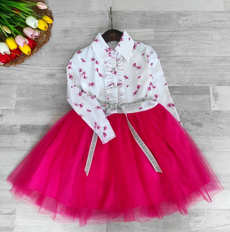 м 🧡В наличии 🧡 Красивое платье с поясом тканина трикотаж со вставками гипюра застегивается на пуговицы замеры: длина юбки без учета фатина/рукав/пог 116-56/40/30 122-60/43/31