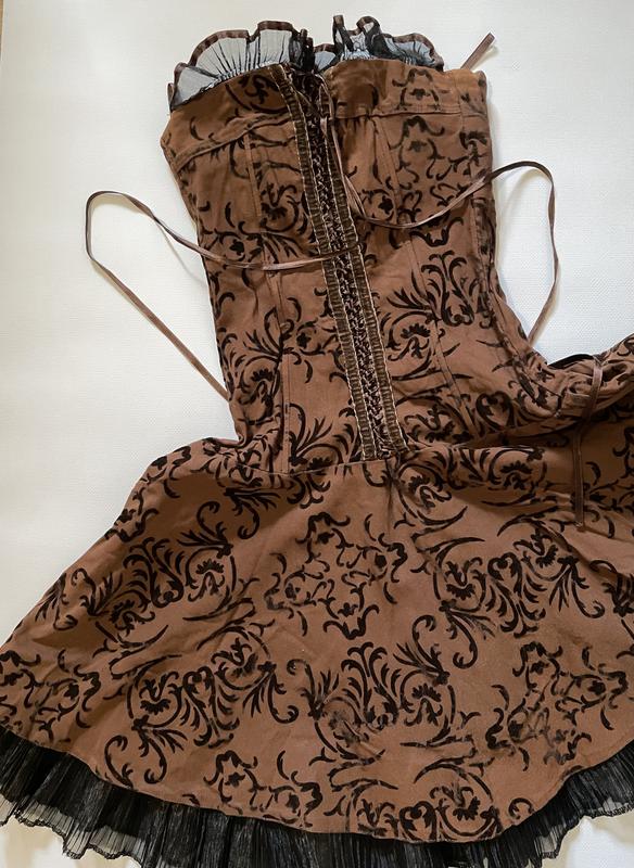 Бархатное платье-корсет «солнцеклеш» с регулируемой утяжкой на атласных шнурках-лентах эластичным верхом; низ декорирован вшитой нижней юбкой с плиссированным воланом; верх также обшит плис-волной. Цвет какао с шоколадными узорами. Возраст 7-9 лет - детальные замеры в лс. На последнем фото - отблеск ленты, НЕ пятно!!!