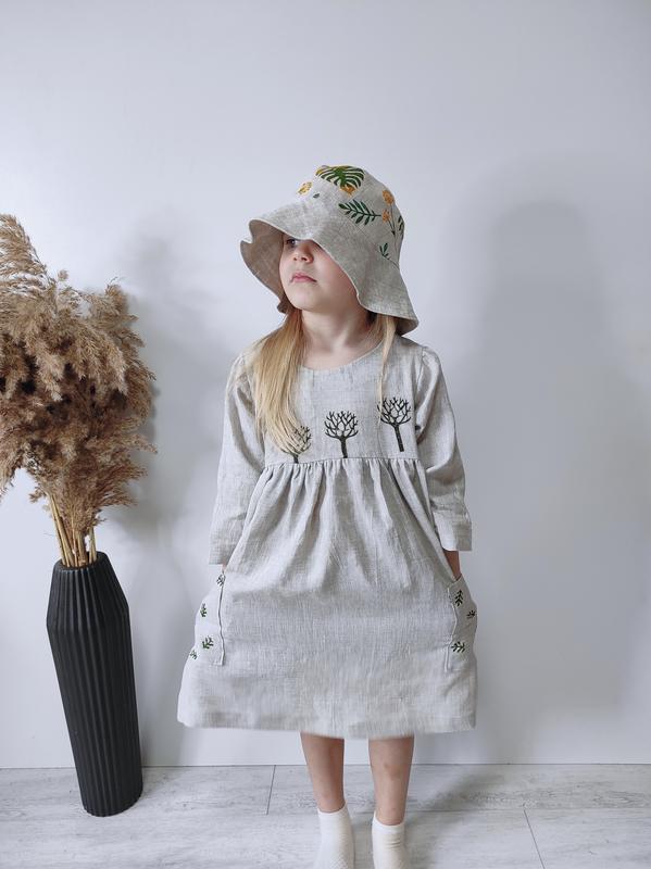 Базовое платье из натурального льна. Удобная и комфортная модель. Рукав 3/4. Рукав подстегивается к короткому. Полностью ручная работа. 100% помякшений льон. Принт на платье нанесен вручную. Возможны вариации рисунков. Это полностью уникальная вещь, хороший вариант подарок. В наличии платье на фото в сером цвете размер 110 (5 лет). Возможен пошив под заказ в размерах от 1 до 12 лет и в разных цветах